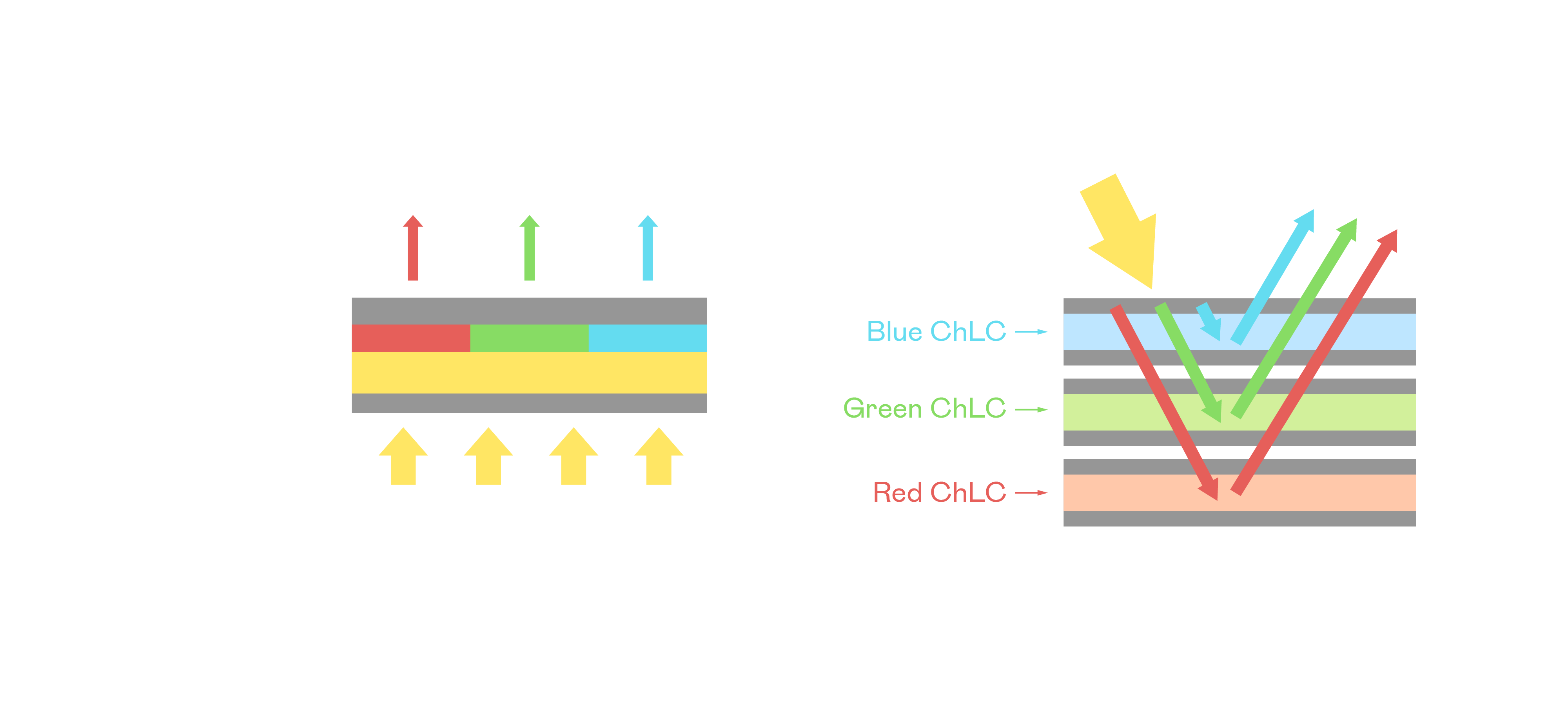 利来国际w66胆固醇液晶显示器是由红、绿、蓝三层胆固醇液晶面板堆叠而成,并采用无彩色滤光片设计,减少环境光在反射过程中的损耗。